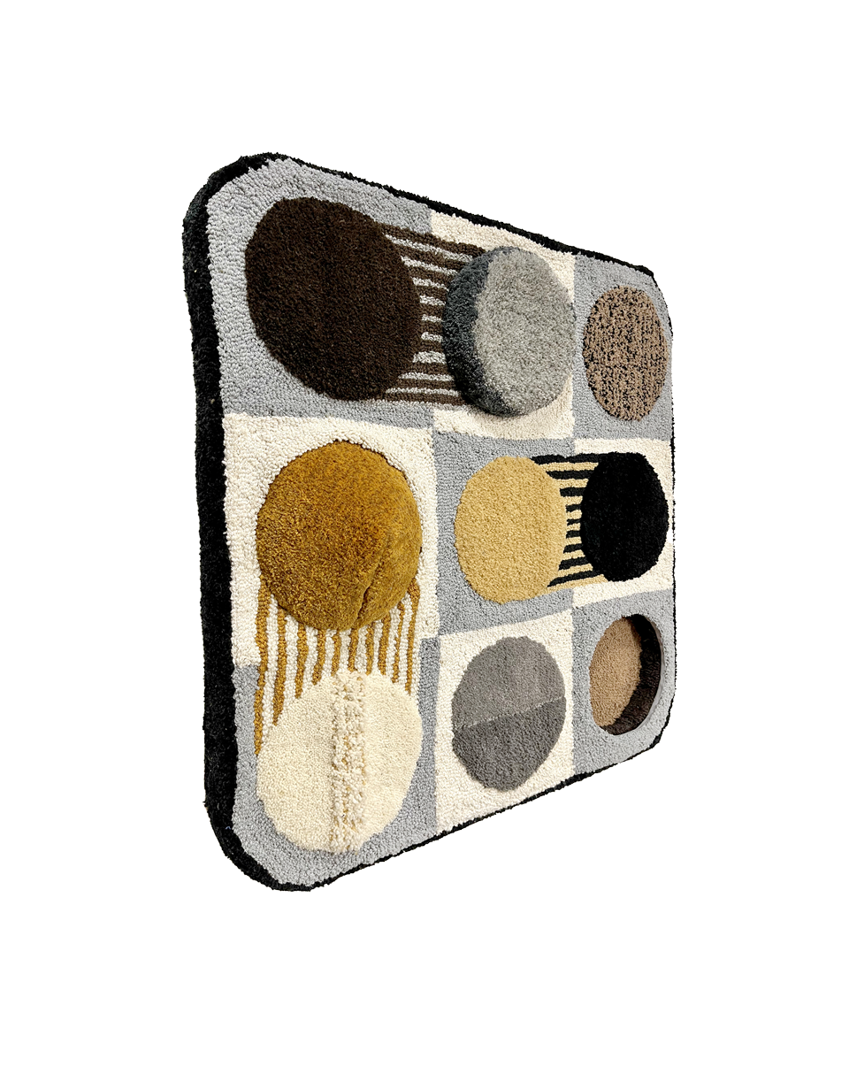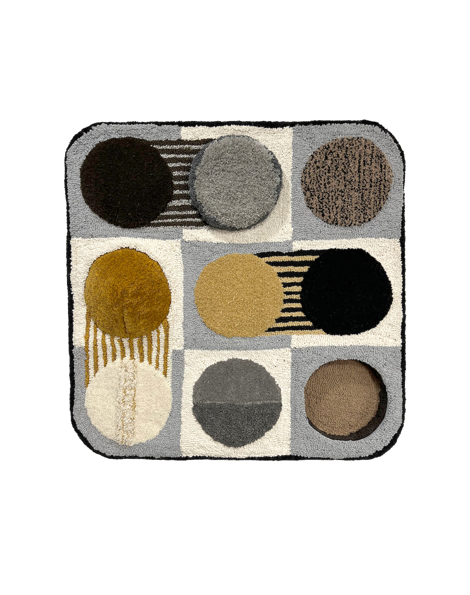 This dimensional, tactile geometric tufted work uses circles to symbolize individual people. We're all uniquely ordered in coexistence. We're individuals who sometimes retreat or stand out. Sometimes we connect with one another, each giving of ourselves. A custom-built interior frame gives dimensionality to the piece.