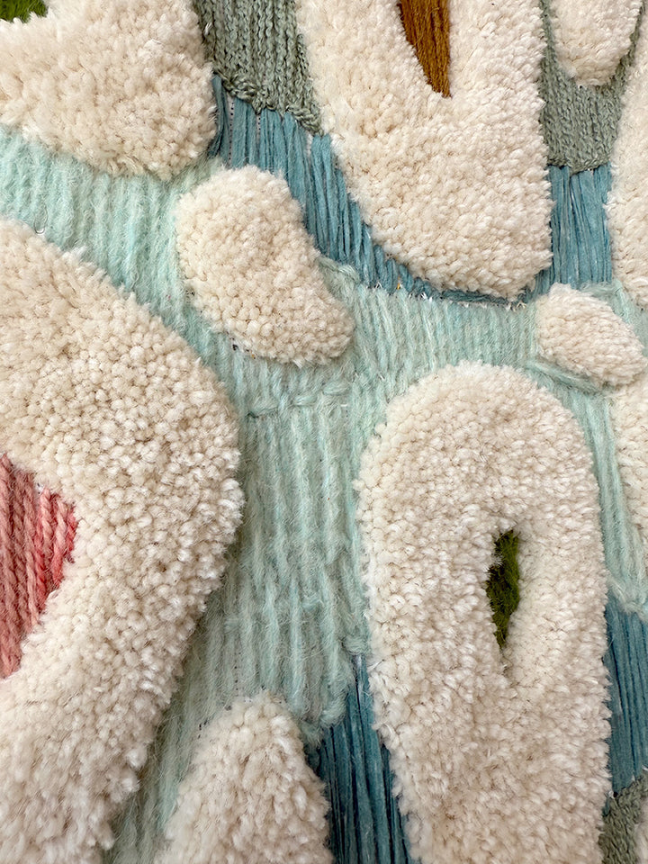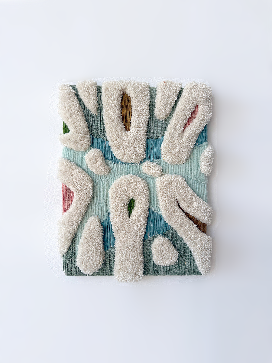 from a spring 2025 body of work, 'gathering' is a dimensional, tactile work composed of wool, cotton, and other reclaimed yarn. the work is an experiment in combining fiber in multiple ways in a manner typically reserved for paintings.