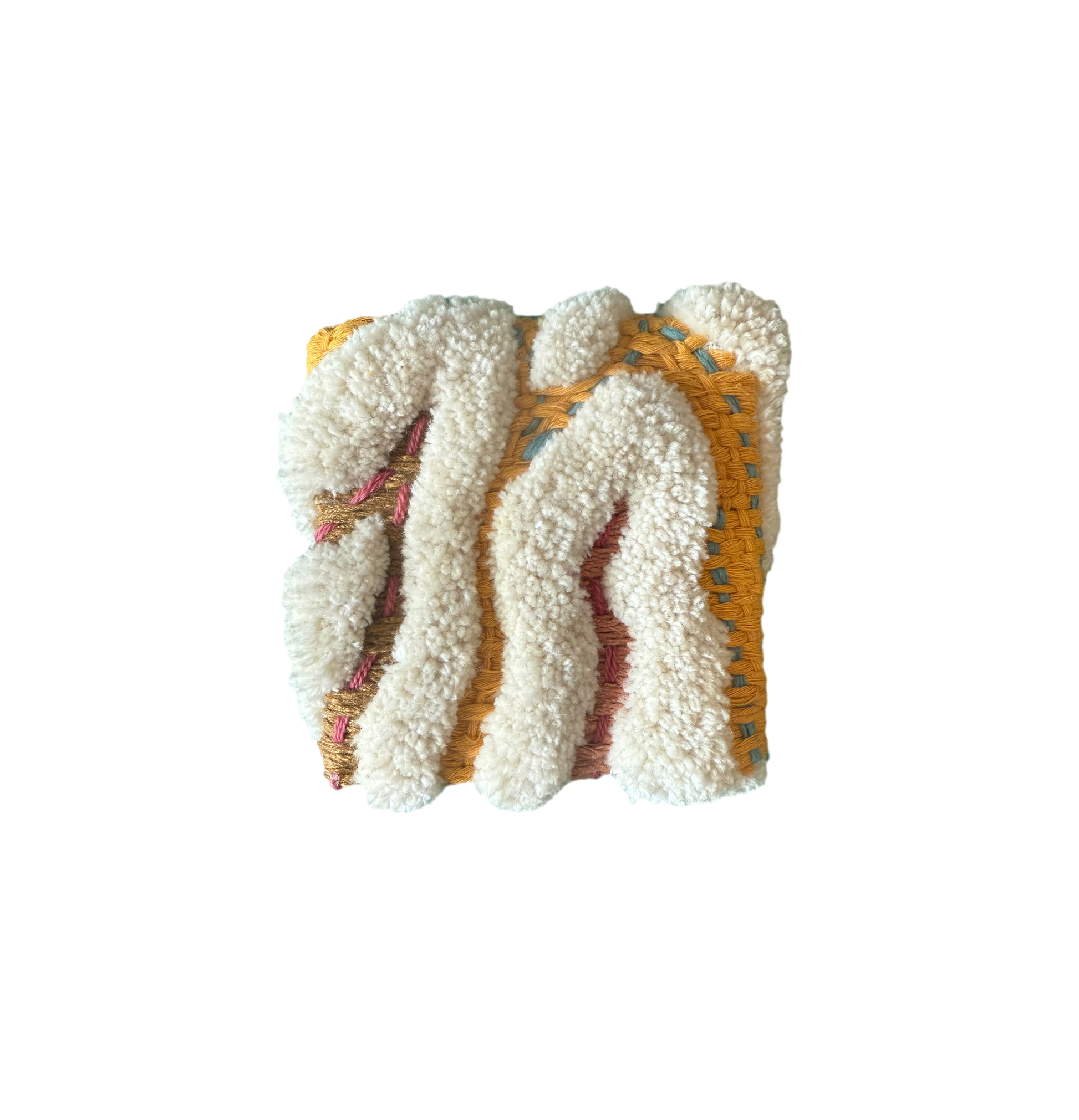 from a spring 2025 body of work, 'canyons 1' is a dimensional, tactile work composed of wool, cotton, and other reclaimed yarn. the work is an experiment in combining fiber in multiple ways in a manner typically reserved for paintings.