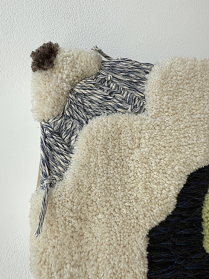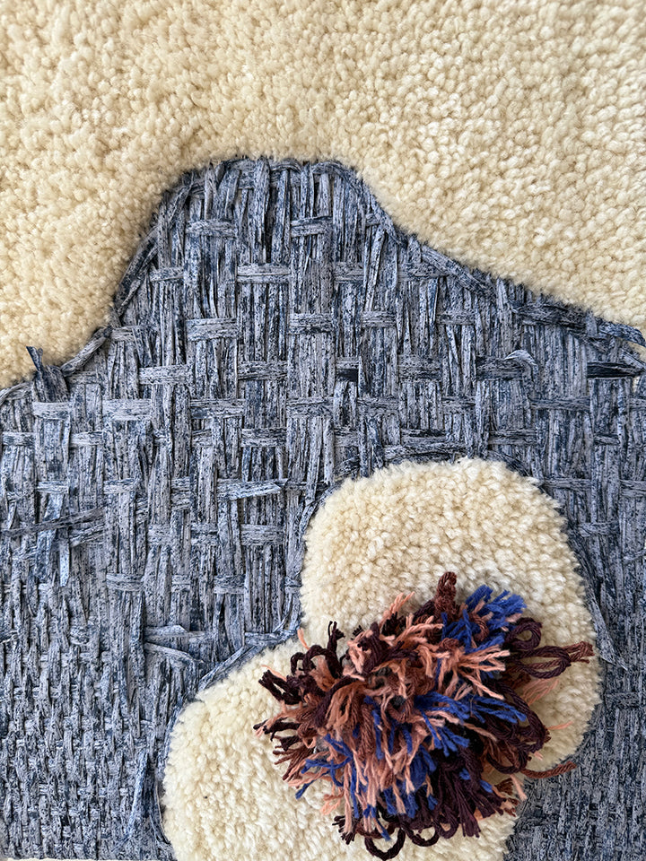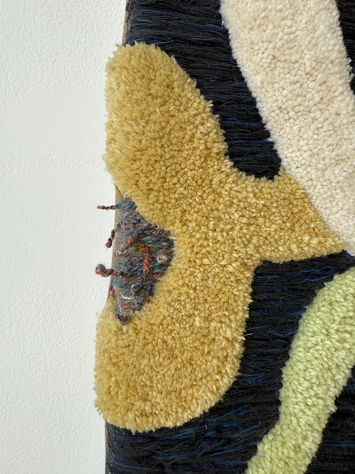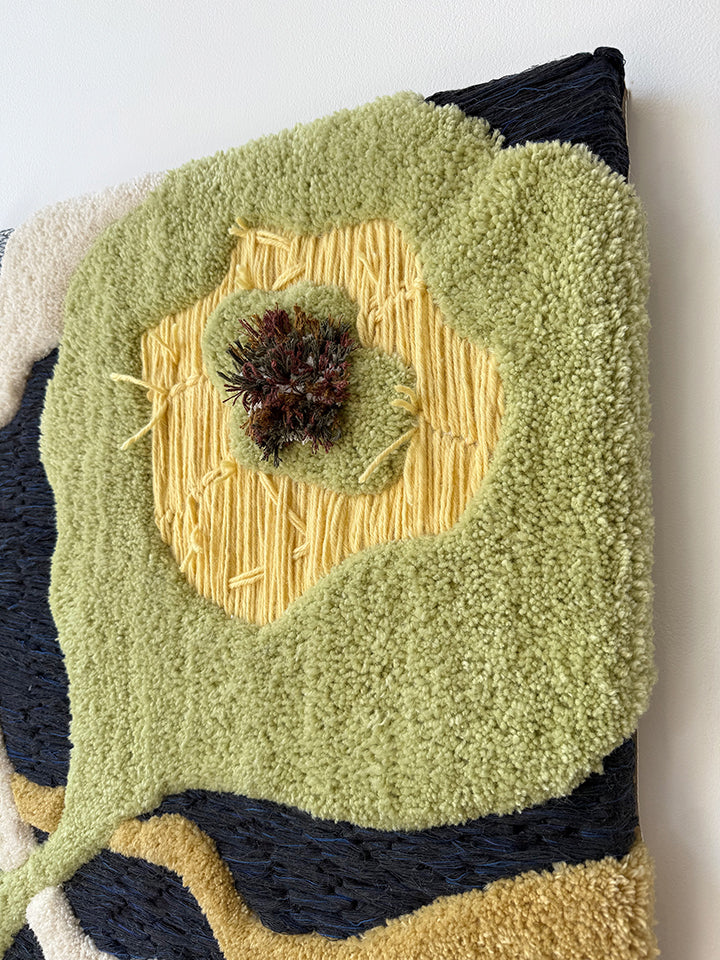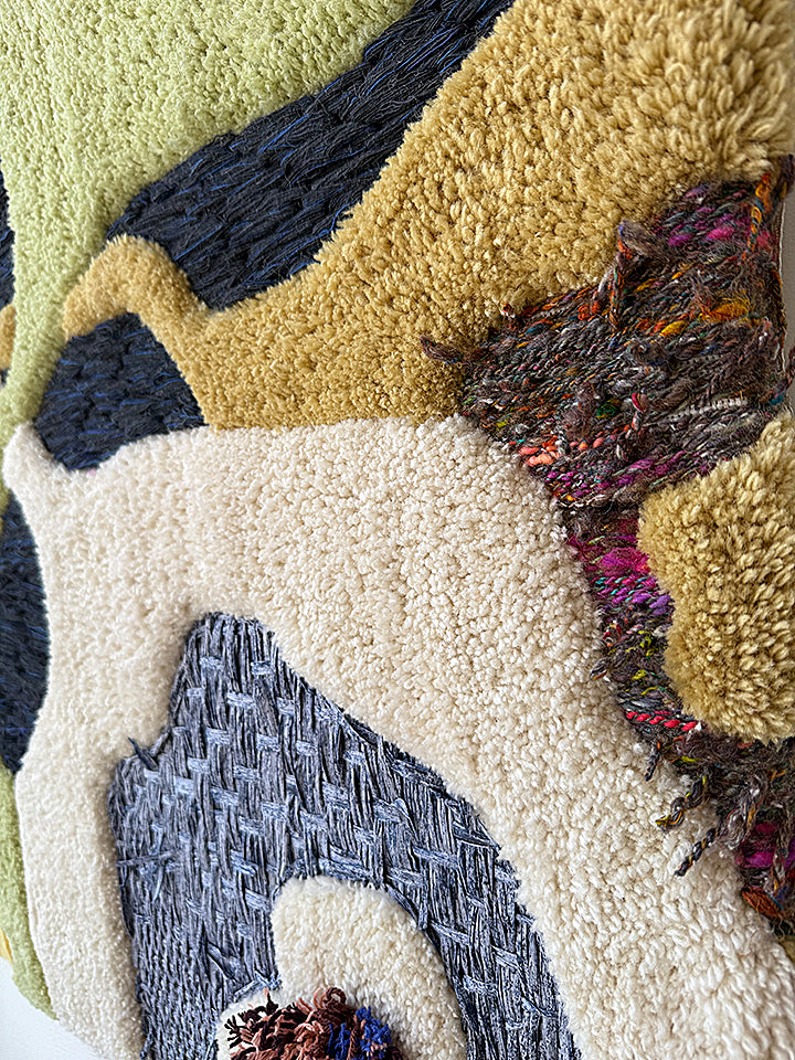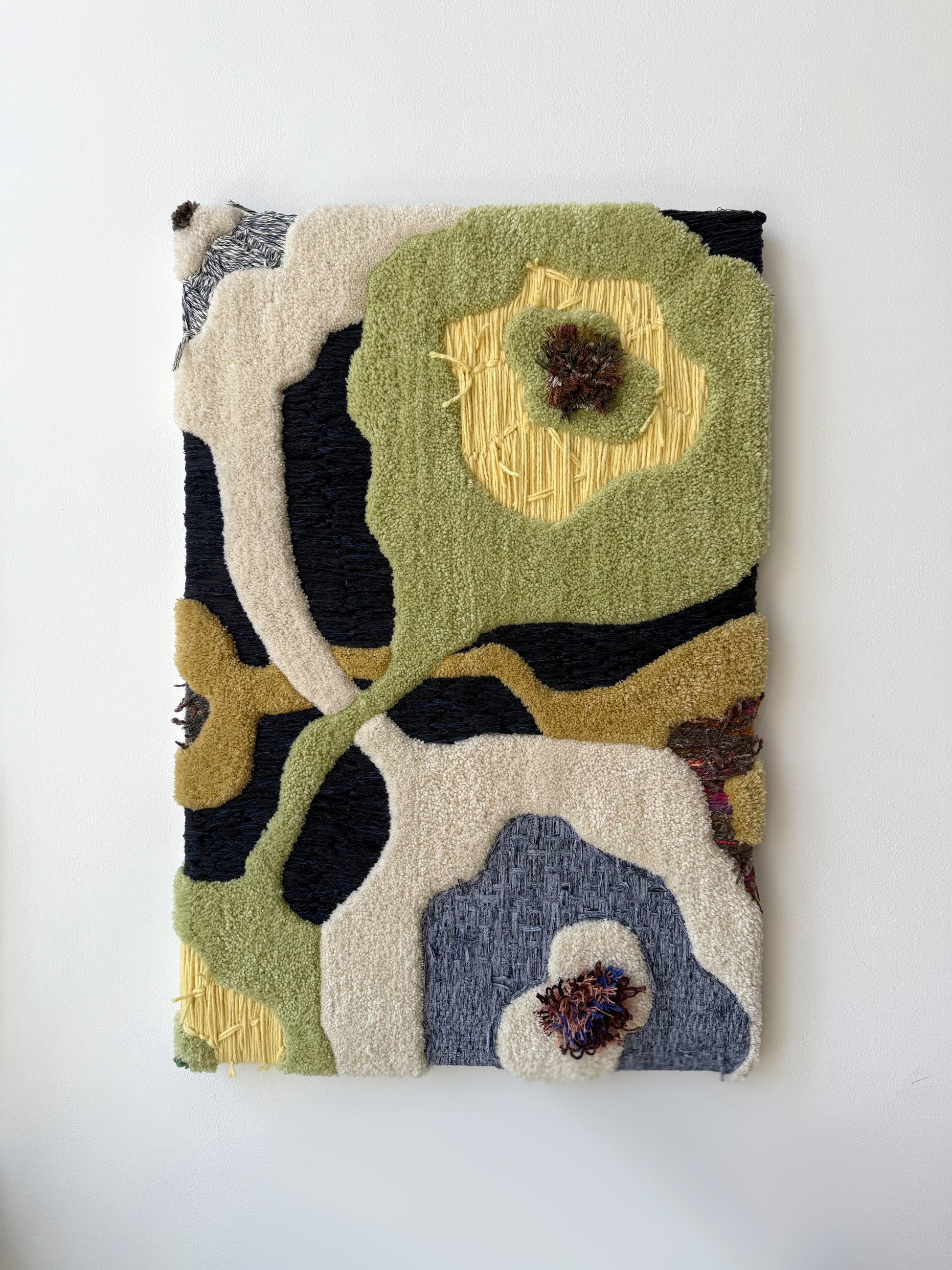 from a spring 2025 body of work, 'plant intelligence 2' is a dimensional, tactile work composed of wool, organic raffia, and reclaimed yarn. comprised by combining both tufted wool and meticulous, slow hand stitching of a variety of fibers.
